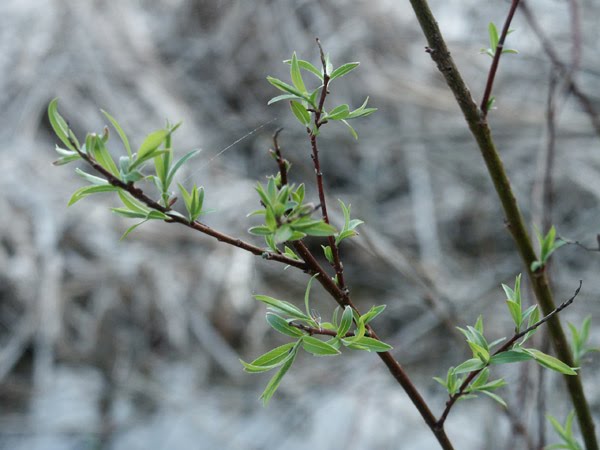 I waited quite a while longer, but my nemesis decided that one little taste was all it'd allow me today and flew well out of camera range. Before I headed for home myself, though, I did take one more picture of the budding branches in front of me, as I liked the way the setting sun illuminated the buds now that it was lower in the sky: