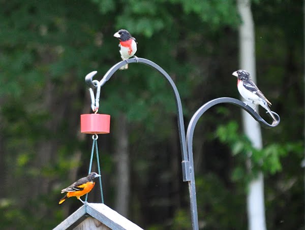 This Baltimore Oriole was joined over where the oriole feeder hangs by a pair of Rose-breasted Grosbeaks, making for a very colorful shot: