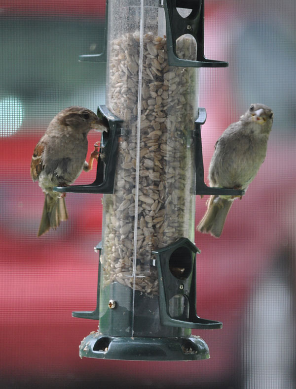 I think it's a female House Sparrow that's looking at an incoming finch this time:
